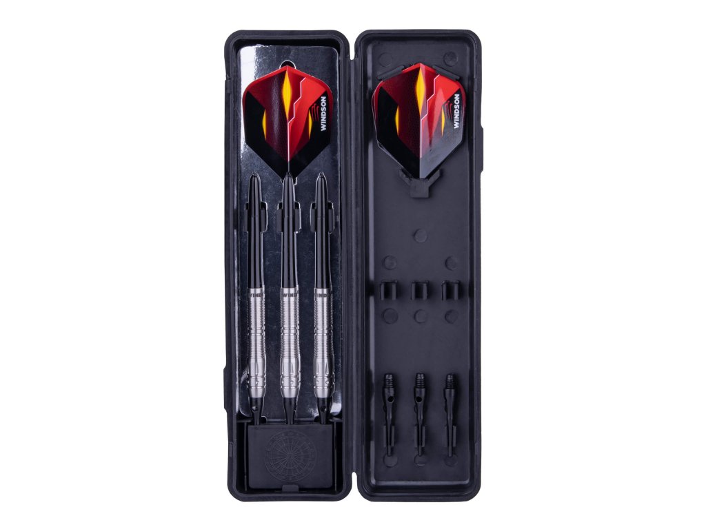 Šipky mají moderní tmavý černo-červený design, který okamžitě upoutá vaši pozornost. Stříbrný barel z 80% wolframu dává šipkám ještě větší eleganci a styl.