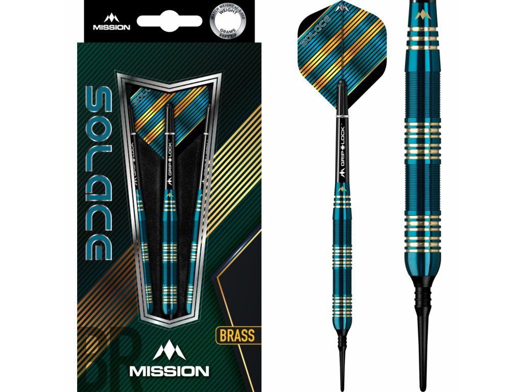 Softové šipky Mission Solace jsou mosazné šipky s barrely v zeleno-zlatém provedení.